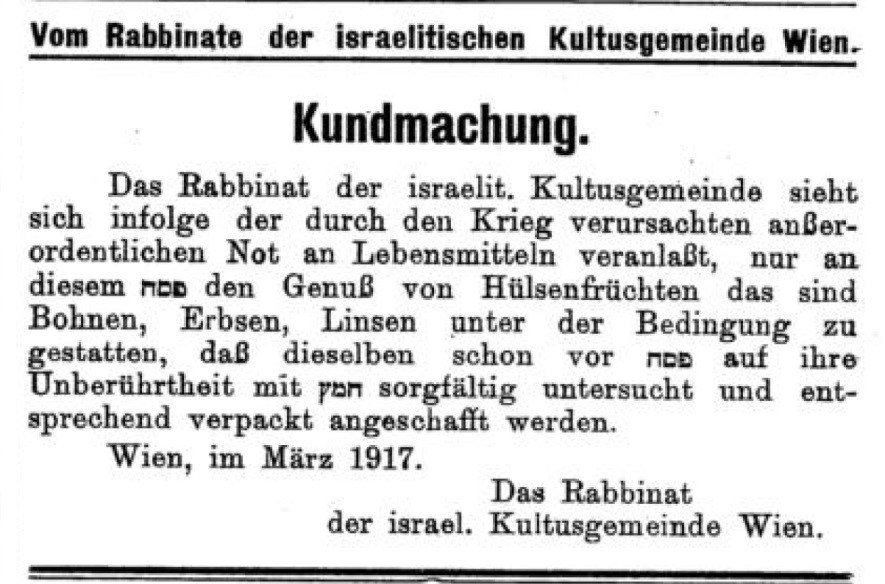 Diese Beschränkungen betrafen auch die Versorgung der jüdischen Bevölkerung mit koscheren, also erlaubten, Lebensmitteln. Gläubige Jüd*innen halten sich an die jüdischen Speisegesetze, die „Kaschrut“. So ist beispielsweise der Verzehr von Schweinefleisch verboten, Schlachttiere müssen möglichst vollständig ausbluten und Fleisch- und Milchprodukte getrennt werden. War vor dem Krieg die Versorgung mit koscherer Kost in Wien, aber auch niederösterreichischen Städten wie St. Pölten oder Baden kein Problem, wurde im Laufe der Kriegsjahre die Versorgung immer schwieriger. Hinzu kam, dass sich zehntausende jüdische Flüchtlinge aus Galizien und der Bukowina im Land befanden, die ebenfalls versorgt werden mussten.